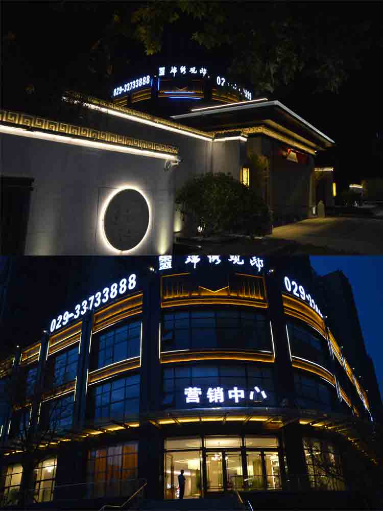 2018 榮盛景秀觀邸售樓部亮化,蘭光設(shè)計師根據(jù)其榮盛景秀觀邸售樓部商業(yè)屬性,商業(yè)照明設(shè)計明亮而醒目,營造商業(yè)經(jīng)營的夜景氛圍。以靜態(tài)的暖色燈光將其打亮,凸顯雅致?!皹s盛景秀觀邸”標(biāo)志以高亮度的燈光,吸引顧客注意,增強商業(yè)宣傳力度。景觀燈造型與建筑外立面造型完美融合,晚上光斑效果與綠植景觀交相輝映,相映成趣!榮盛景秀觀邸的亮化設(shè)計施工,獲得了客戶的高度認可。